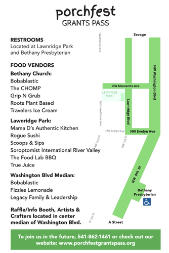 Porchfest is a fun, free, family-friendly music festival taking place on the front porches of vintage homes in the historic NW Washington Blvd, Grants Pass neighborhood. Featuring over 20 musical acts volunteering to perform for your entertainment!